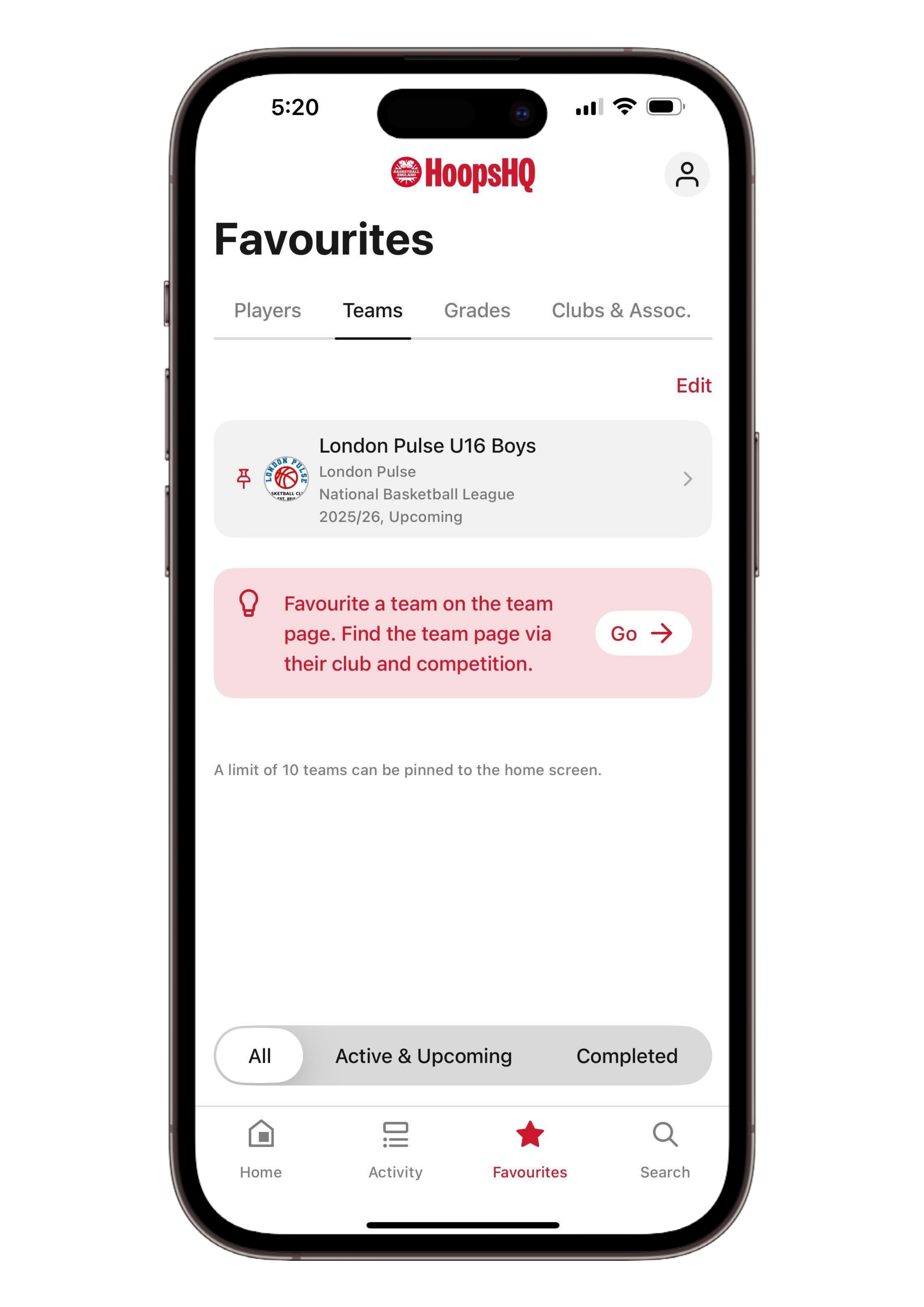 When you ‘favourite’ a team or grade, your home screen will be setup with shortcuts to quickly access results and stats from any court.